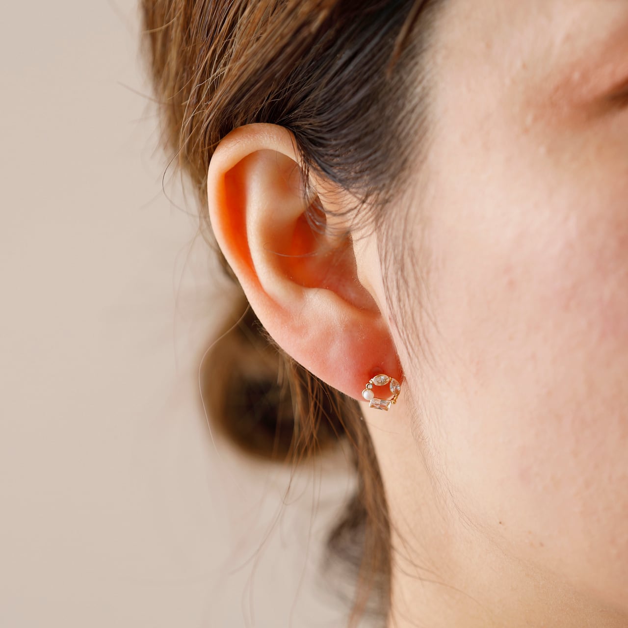 光を放つキュービックジルコニアやパールをサークル状につなげた小さなピアスです。