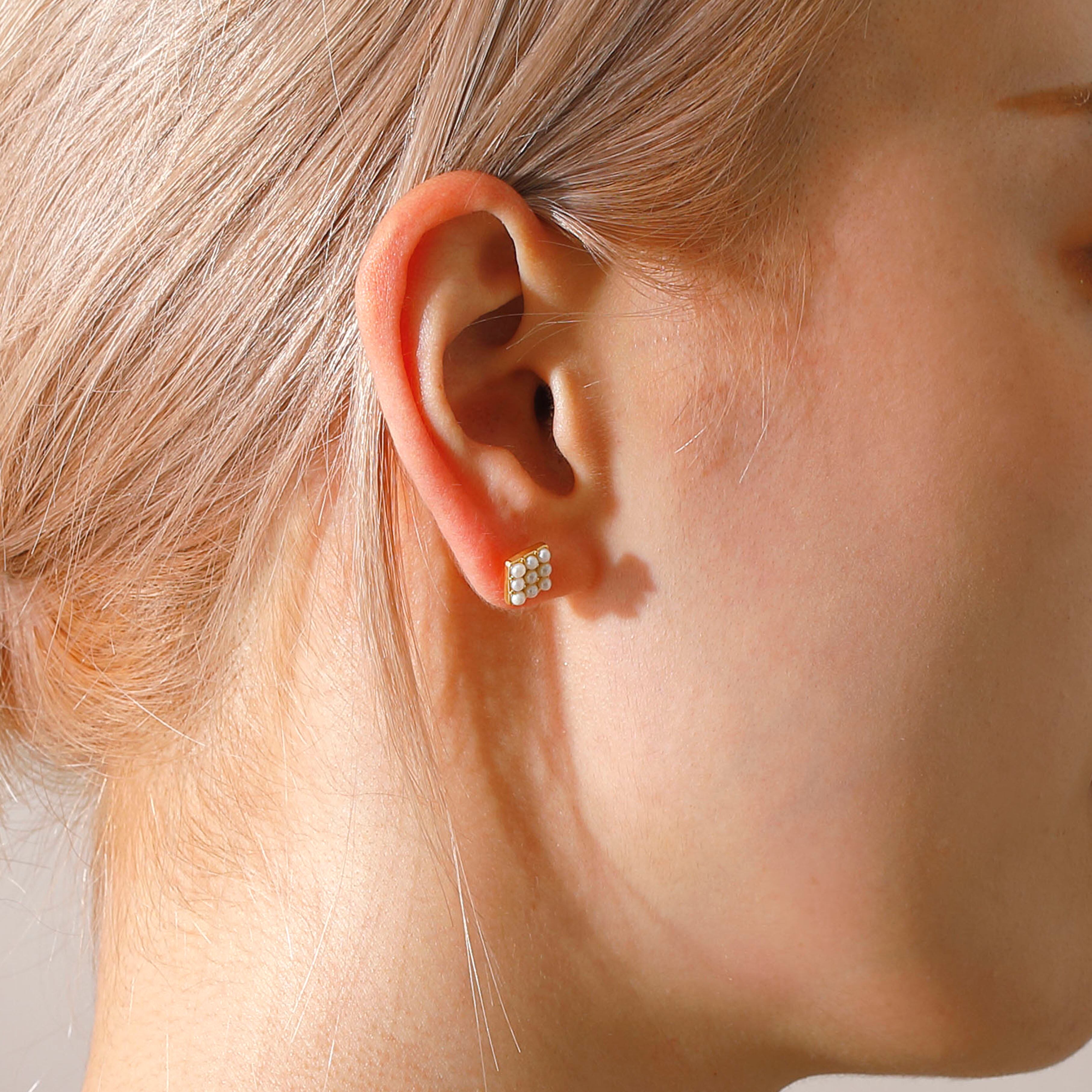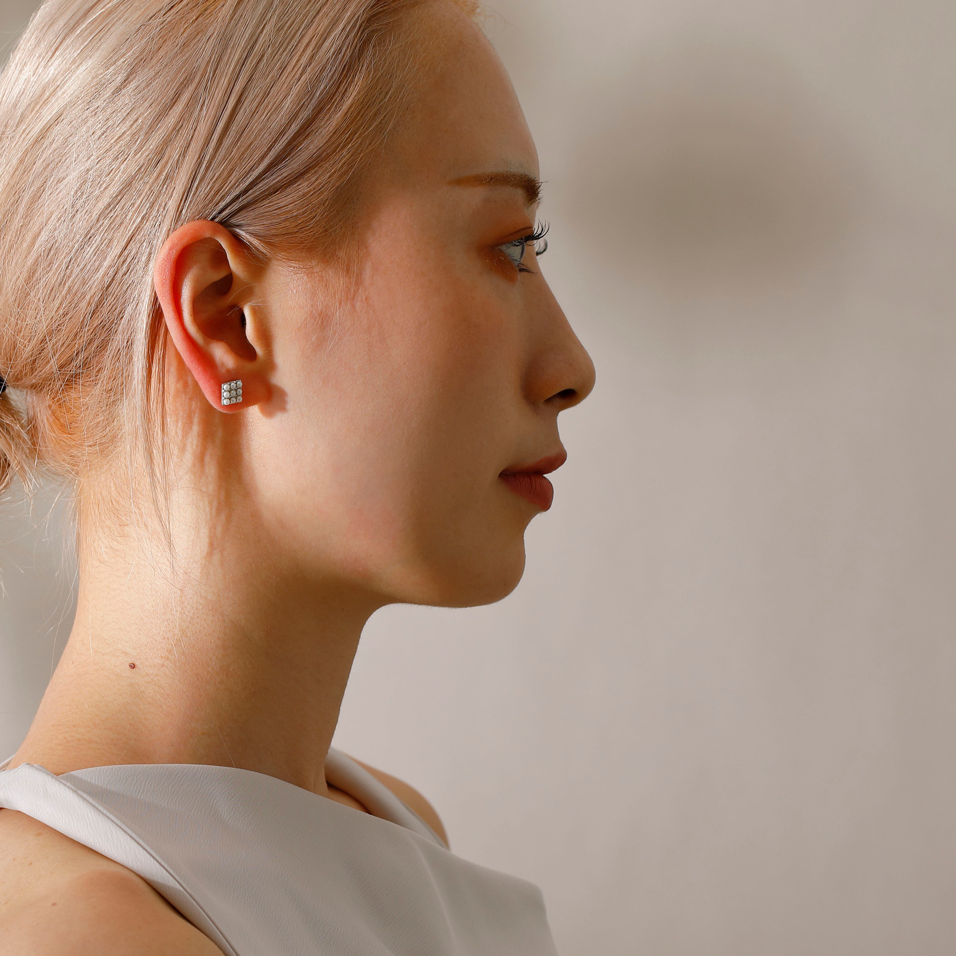 四角いフレームに9つのパールが行儀よくならんだデザインのピアスです。